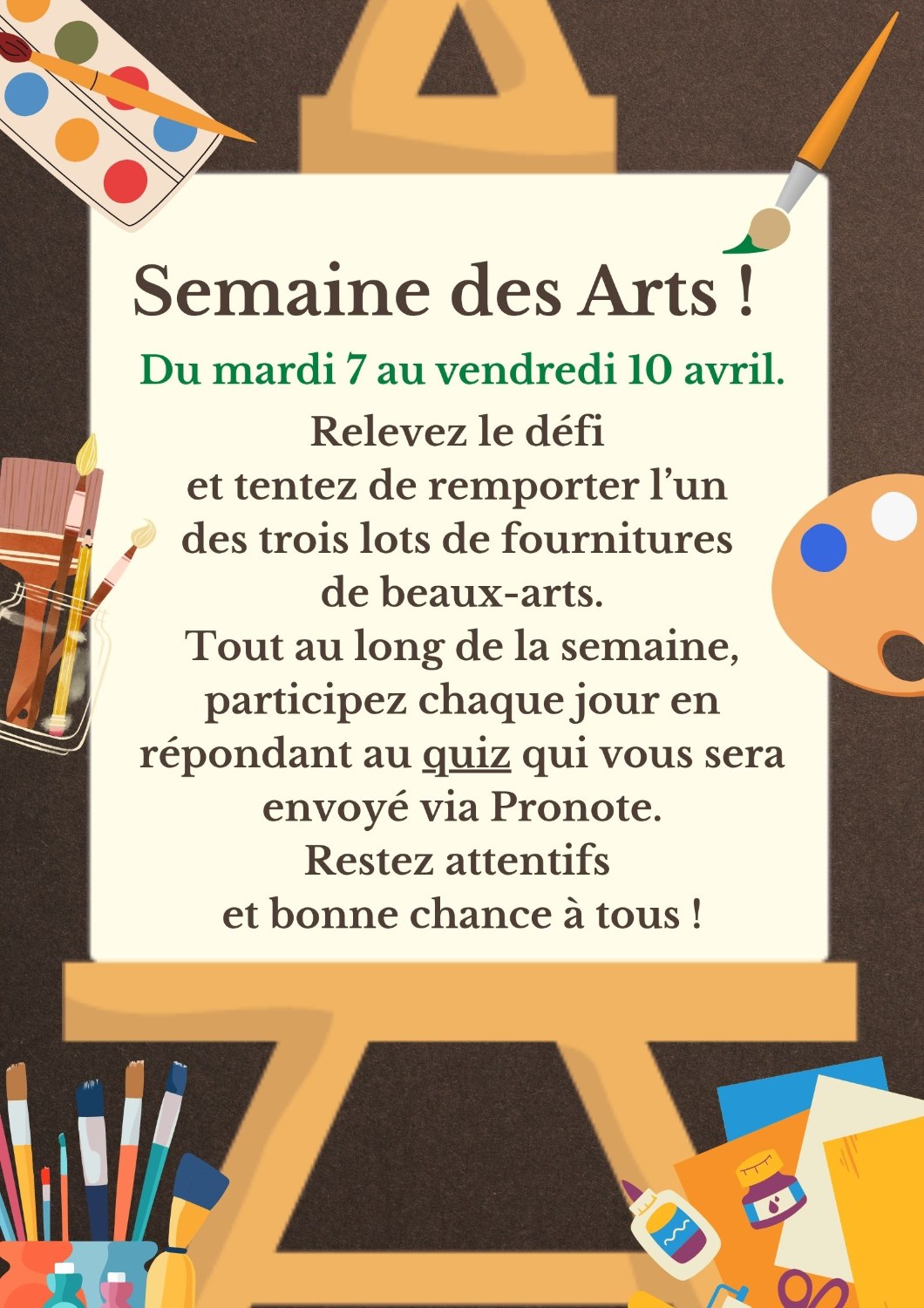La semaine du lundi 7 avril au vendredi 10 avril a lieu la Semaine des Arts et pour cette (...)
